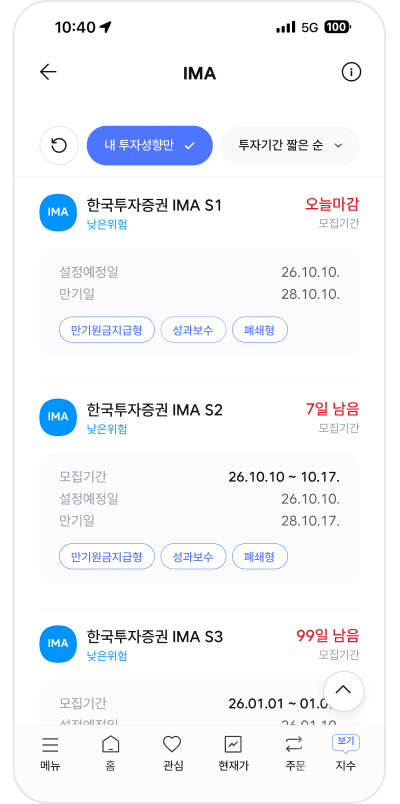 • 당사는 IMA에 대하여 어떠한 형태의 목표, 예상, 약정 수익률도 제시하지 않습니다. 실제 수익률은 운용 성과에 따라 달라질 수 있습니다.