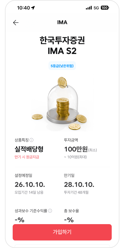• IMA는 당사(AA, 2025.10.22, 한국기업평가)의 신용위험(부도, 파산 등)에 따른 투자원금의 전부 또는 일부 손실이 발생할 수 있습니다. 다만, 이 경우에도 IMA 운용자산을 자기신탁을 통해 구분관리하므로 운용자산 매각 및 청산을 통해 고객의 투자원금을 우선적으로 변제 받을 수 있습니다.